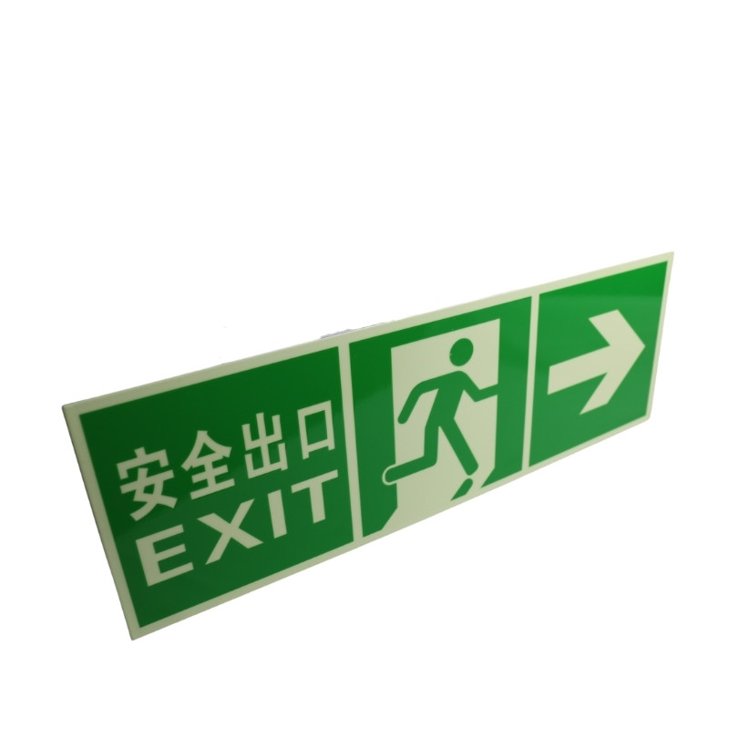 Resplandor luminoso de aluminio en la muestra oscura de la salida de emergencia con los colores amarillos claros, verdes, azules y otros, el uso del tipo ligero material del almacenamiento de la uno mismo-iluminación, con la absorción de la luz, la función ligera del almacenamiento, el lugar brillante de absorber luz del sol, las luces y la otra luz visible por 10-20 minutos, luz sostenible más de 8-12 horas.